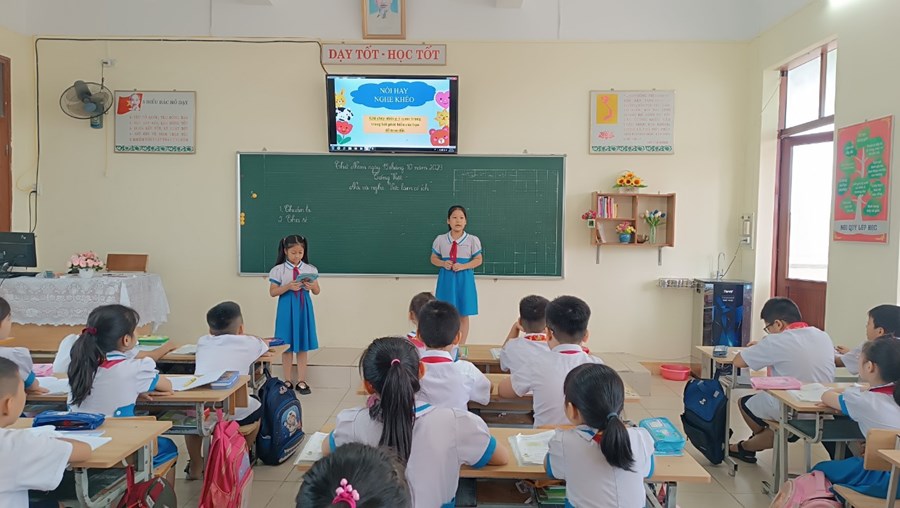 Thể hiện tiết Tiếng Việt bài: "Nói và nghe: Việc làm có ích" là cô giáo Phạm Thị Ngọc và các em HS lớp 4A2.