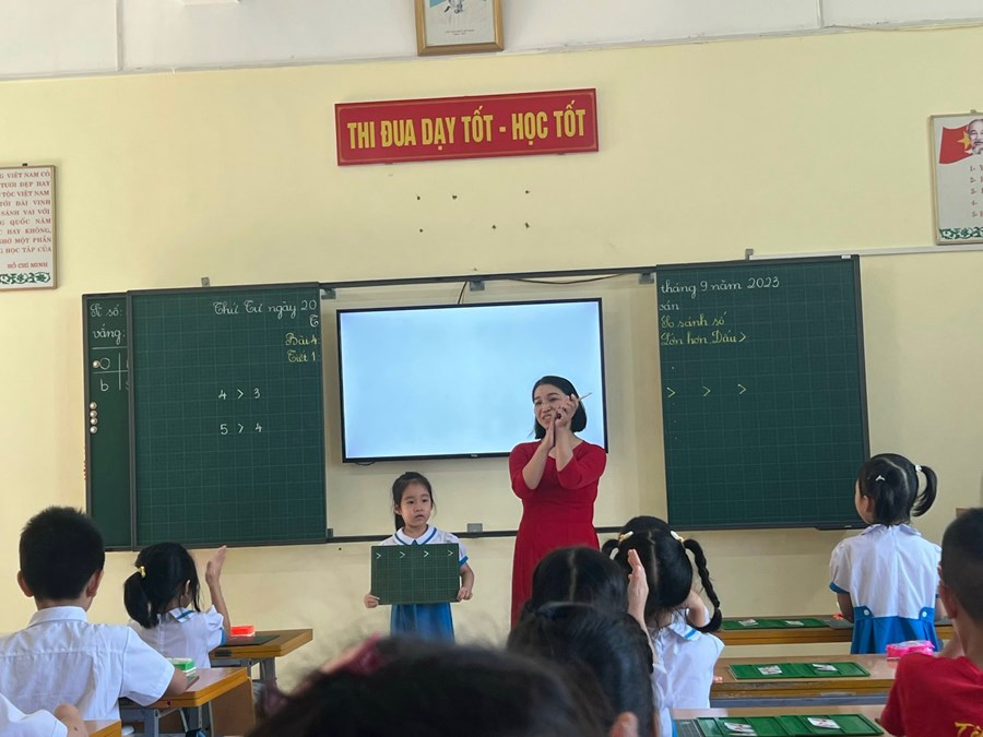 Thể hiện bài 4: "So sánh số: Lớn hơn, dấu > - Tiết 1" là cô giáo Vũ Thị Thúy Hà và các em HS lớp 1A3.