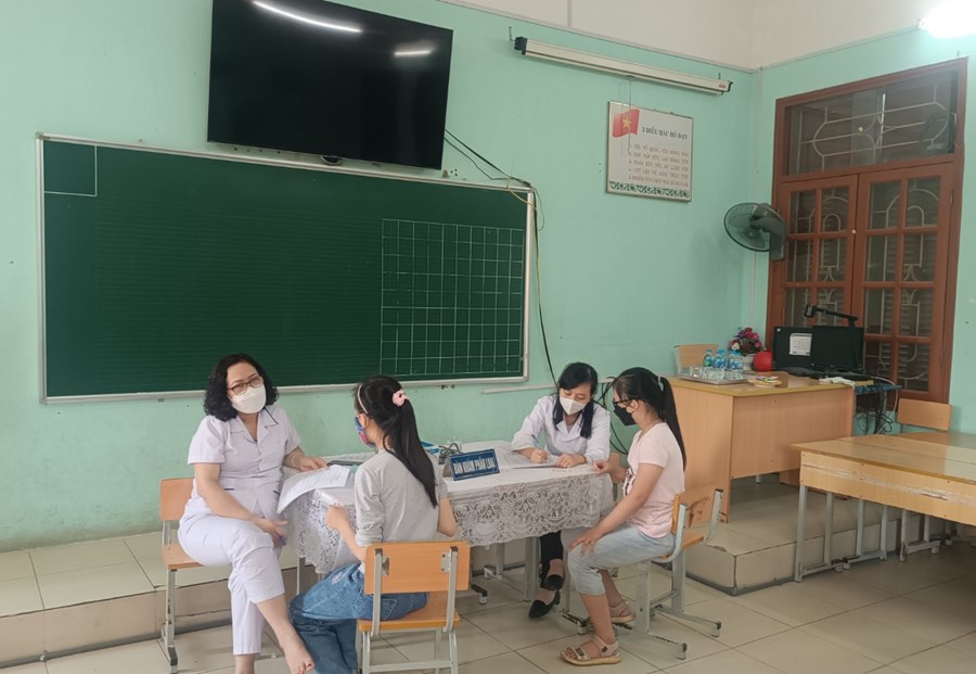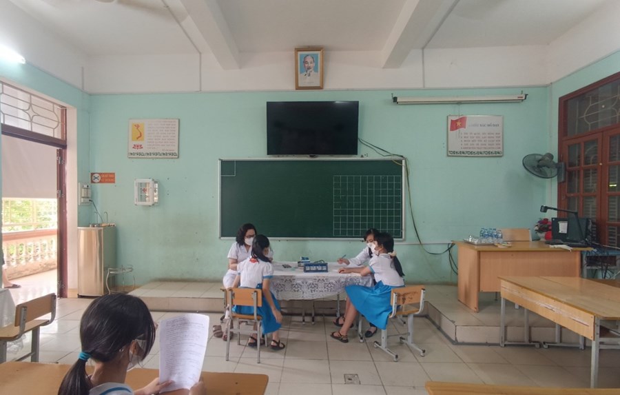 Tại khu vực phòng chờ, học sinh được chia vào các lớp để nhận phiếu tiêm. Trước khi tiêm, học sinh được kiểm tra sức khoẻ và khám sàng lọc. Công tác khám sàng lọc diễn ra nhanh chóng và đúng quy trình. Trong quá trình tiêm, học sinh có giáo viên chủ nhiệm đi kèm để động viên tinh thần, giúp học sinh bình tĩnh và hợp tác.