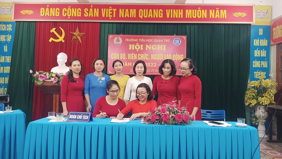 Hội nghị đã thực hiện kí kết giao ước thi đua giữa công đoàn và nhà trường. Đây là việc làm thể hiện sự nhất trí, trên dưới một lòng quyết tâm thực hiện tốt nhiệm vụ năm học 2022 - 2023 của tập thể cán bộ, giáo viên, nhân viên trường Tiểu học Quán Trữ.