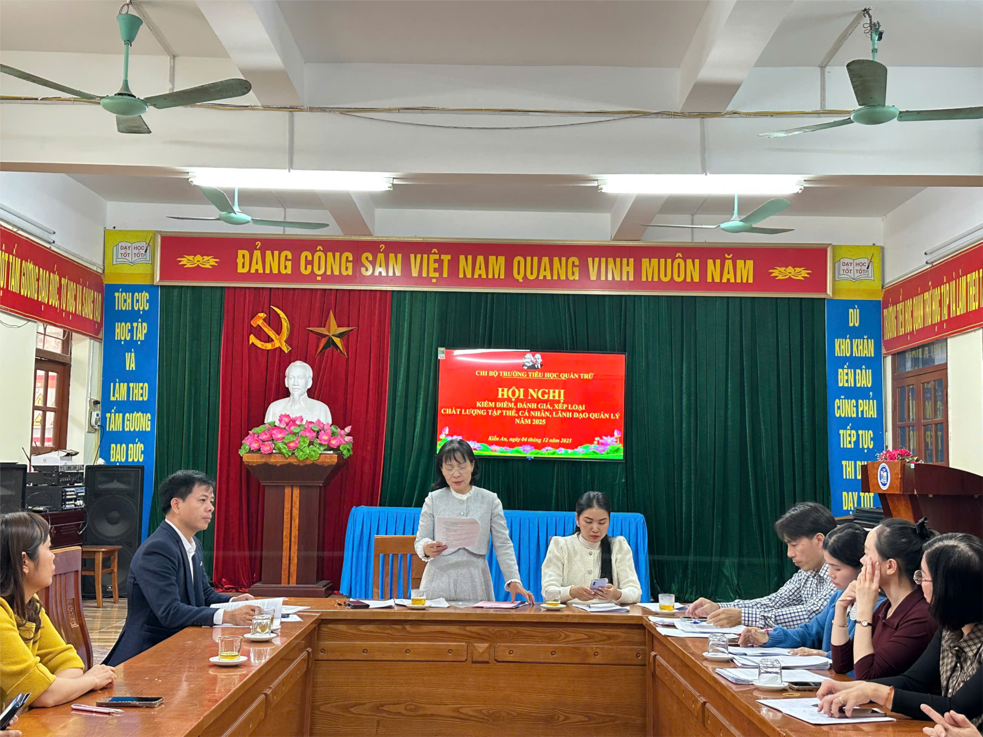 Thực hiện Hướng dẫn số 05-HD/ĐU của Ban thường vụ Đảng ủy phường Kiến An về kiểm điểm và đánh giá, xếp loại chất lượng đối với tập thể và cá nhân năm 2025, chiều ngày 04/12/2025, Chi bộ Trường Tiểu học Quán Trữ đã tổ chức thành công Hội nghị kiểm điểm, đánh giá, xếp loại chất lượng tập thể, cá nhân, lãnh đạo quản lý năm 2025.