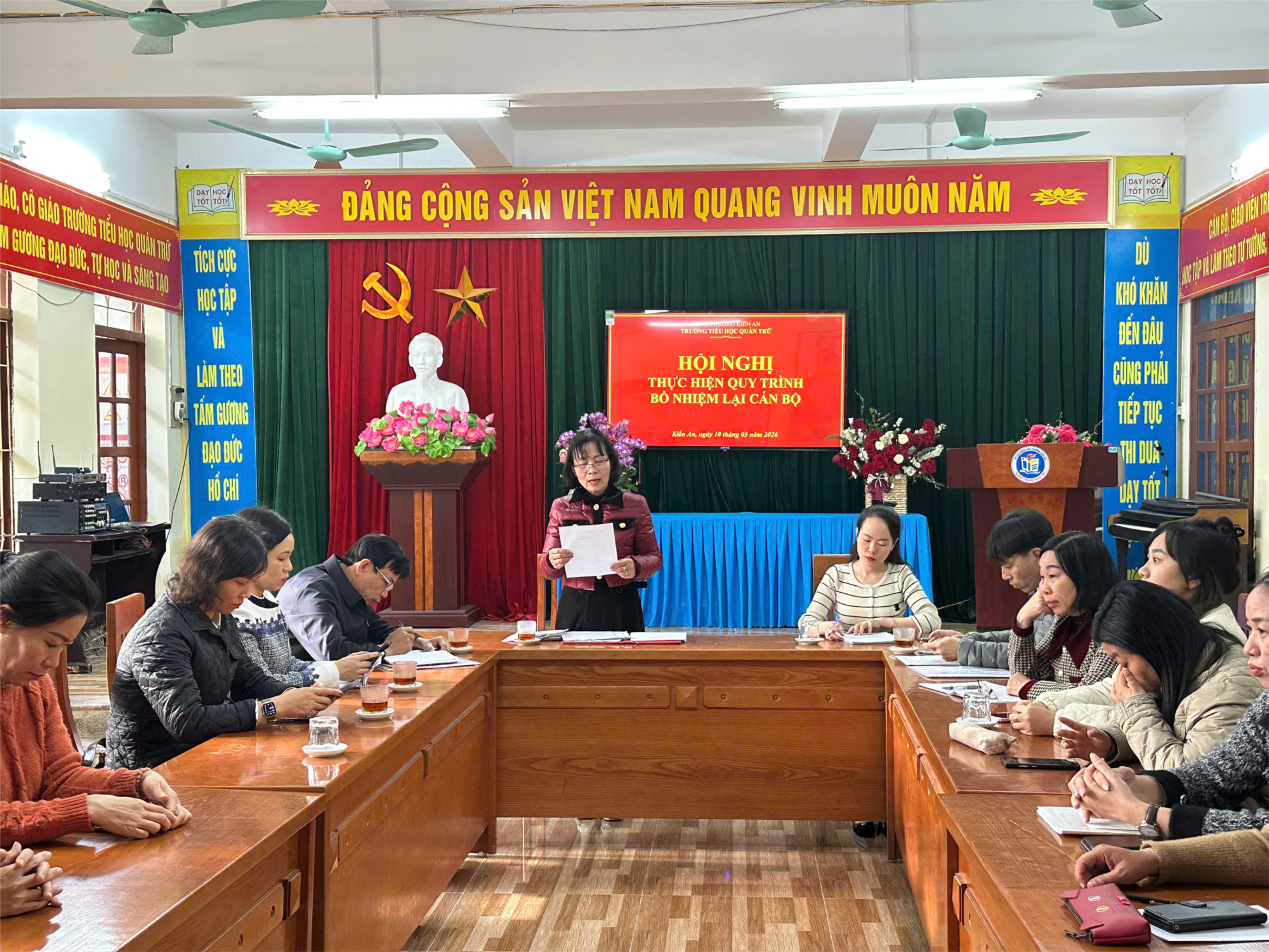 Thực hiện Thông báo số 195-TB/ĐU, ngày 26/02/2026 của Ban Thường vụ Đảng ủy phường Kiến An “Về việc thực hiện quy trình bổ nhiệm lại chức vụ Phó Hiệu trưởng Trường Tiểu học Quán Trữ”, sáng ngày 10/03/2026, trường Tiểu học Quán Trữ tổ chức Hội nghị thực hiện quy trình bổ nhiệm lại chức vụ Phó Hiệu trưởng đối với đồng chí Phạm Trung Long.