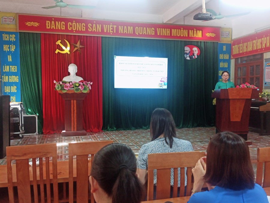 Hội nghị đã được nghe báo cáo tổng kết năm học 2022 - 2023 và phương hướng nhiệm vụ năm học 2023 - 2024 do đồng chí Vũ Thị Minh - Bí thư Chi bộ - Hiệu trưởng nhà trường trình bày. Báo cáo điểm lại các nhiệm vụ giáo dục đã thực hiện, tổng hợp kết quả đạt được của thầy và trò nhà trường trong năm học, chỉ rõ những khó khăn, hạn chế của nhà trường.