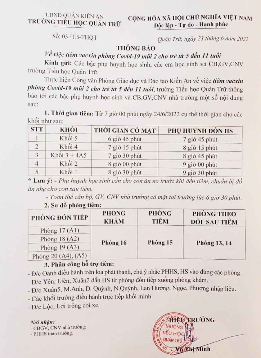 Thực hiện Công văn PGD&ĐT Quận Kiến An về việc tiêm vaccine phòng Covid mũi 2 cho trẻ từ 5 đến 11 tuổi, trường Tiểu học Quán Trữ xin thông báo tới các bậc phụ huynh học sinh, các em học sinh lịch tiêm sáng thứ 6 (ngày 24/6/2022)