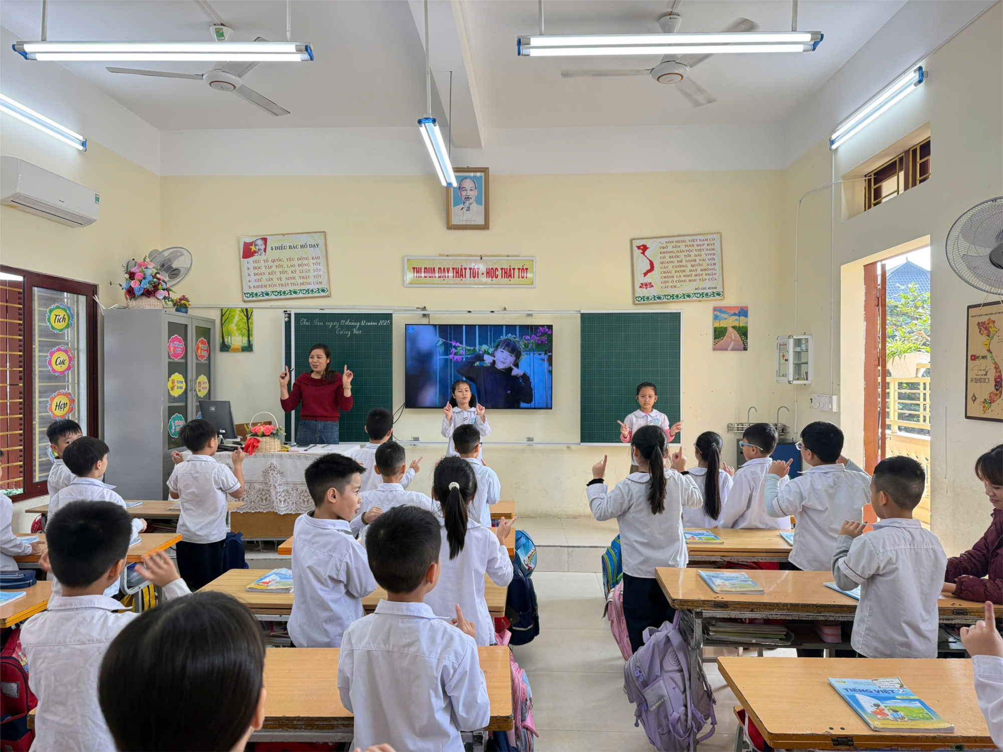 Trong tiết học minh họa, các em được tham gia nhiều hoạt động học tập thú vị và trải nghiệm đa dạng các hình thức học tập như: học thông qua trò chơi, thảo luận nhóm, chia sẻ tích cực… Đặc biệt trong tiết học giáo viên ứng dụng AI hiệu quả tạo sự thích thú cho học sinh khi tham gia tiết học. Không khí lớp học rộn ràng, hào hứng.