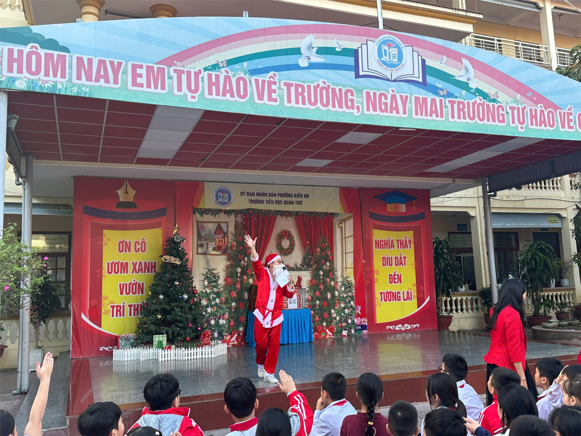 ơn gió se lạnh và ánh sáng lung linh từ những chiếc đèn màu sắc đang tỏa sáng khắp mọi nơi. Sân trường Tiểu học Quán Trữ đã thực sự bừng sáng trong không khí Giáng sinh ấm áp, rộn ràng và đầy ắp tiếng cười. Chương trình Noel được tổ chức dưới sân trường với nhiều hoạt động hấp dẫn, mang đến cho các em học sinh một ngày hội đáng nhớ.