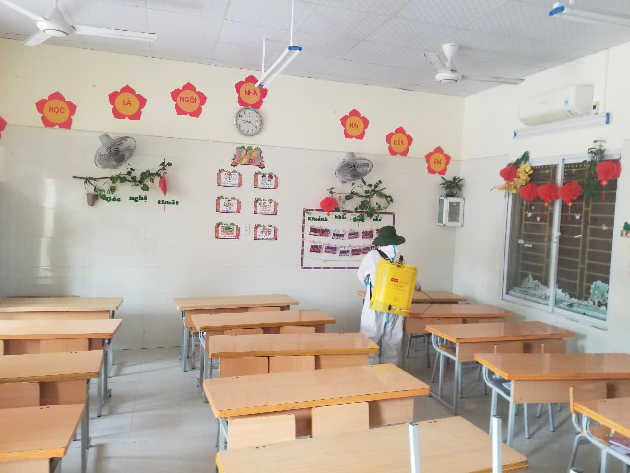phương để sử dụng thuốc an toàn và hiệu quả. Các khu vực trong trường, bao gồm phòng học, nhà vệ sinh, khu vực có cây xanh và sân chơi đều được phun thuốc cẩn thận để tiêu diệt muỗi và ấu trùng.