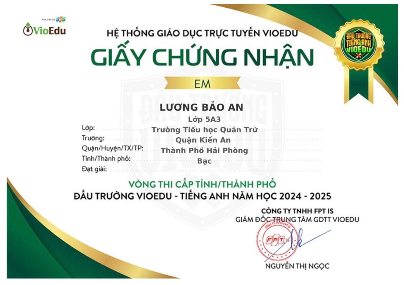 Lương Bảo An – Lớp 5A3: Đạt giải Bạc cấp Thành phố môn Tiếng anh với điểm số tuyệt đối.